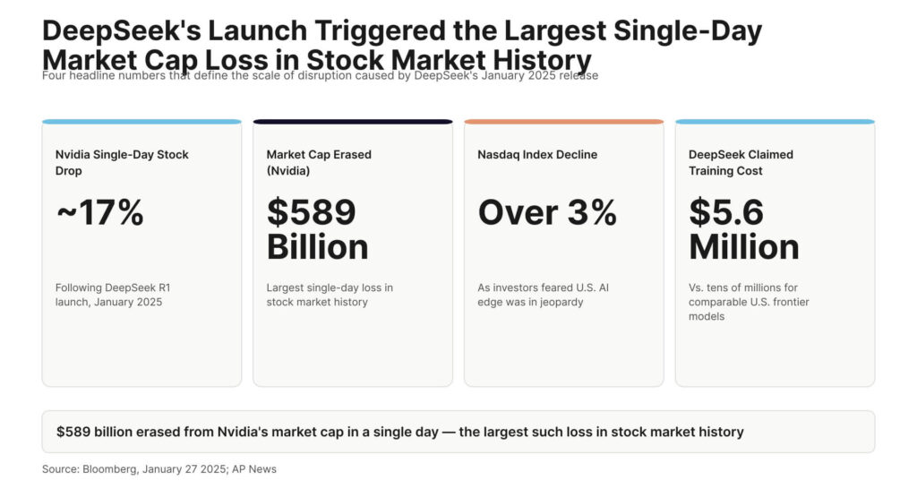 DeepSeek’s January 2025 launch was the most disruptive single event in AI since ChatGPT’s debut. Bloomberg reported that NVIDIA’s stock dropped approximately 17% in a single session, erasing $589 billion in market value — the largest single-day market cap loss in stock market history. The Nasdaq fell over 3% as investors concluded that U.S. AI companies’ competitive advantage might be less durable than their valuations implied.