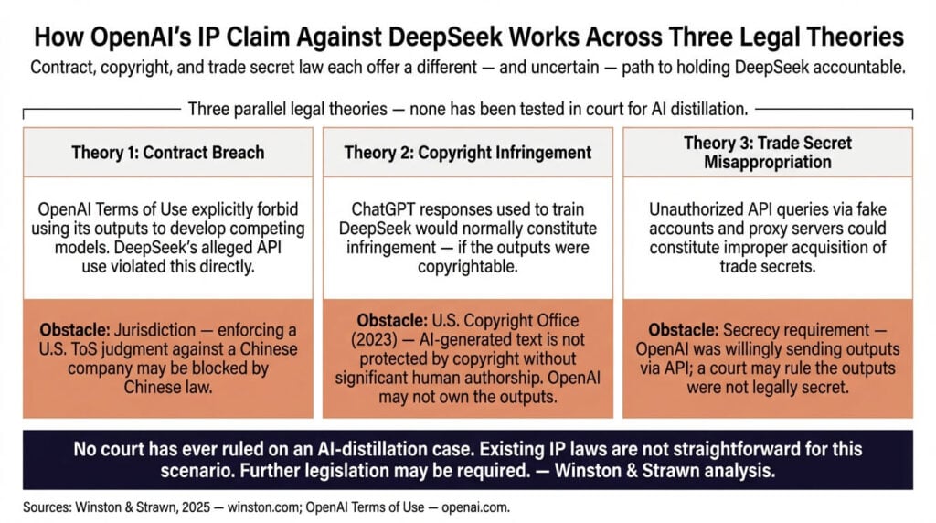 How OpenAI’s IP Claim Against DeepSeek Works Across Three Legal Theories — Source: Winston & Strawn IP Analysis, 2025; OpenAI Terms of Use