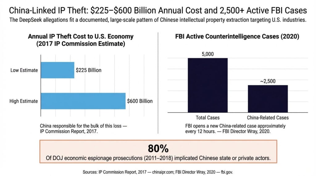 The quantitative picture of China and intellectual property theft is significant enough that it warrants precise attribution rather than summary. The IP Commission’s figures — $225 billion on the low end, $600 billion on the high end annually — represent direct economic losses from counterfeit goods, pirated software, and theft of trade secrets. The FBI’s reported caseload includes hundreds of prosecutions specifically for trade secret theft with a China nexus over the past five years.