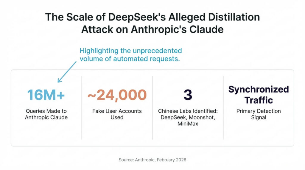 The most technically substantive response to distillation attacks came from Anthropic, which published detailed research titled “Detecting and Preventing Distillation Attacks” — naming DeepSeek, Moonshot AI, and MiniMax as entities it investigated. Anthropic’s findings are striking: the three Chinese labs collectively made over 16 million queries to Claude using approximately 24,000 fake user accounts, according to the published research. The scale of coordinated API access, the use of fake accounts to distribute queries and evade detection, and the systematic nature of the querying patterns all pointed to organized distillation campaigns rather than ordinary usage.