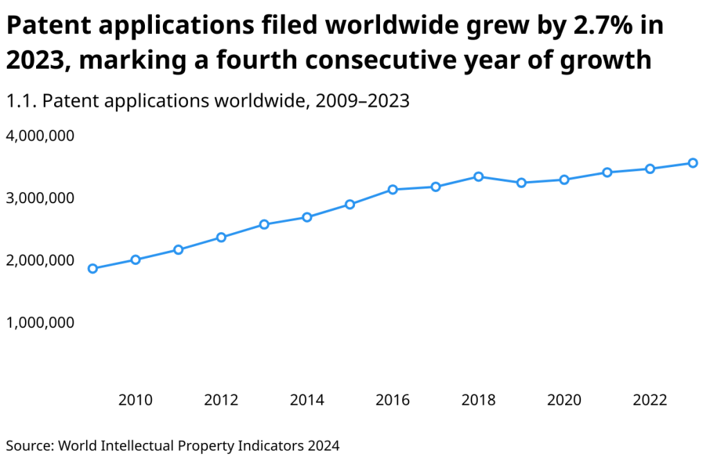 Patent activity has been booming. In 2023, innovators filed 3.55 million applications globally, a record high.