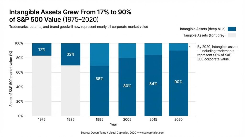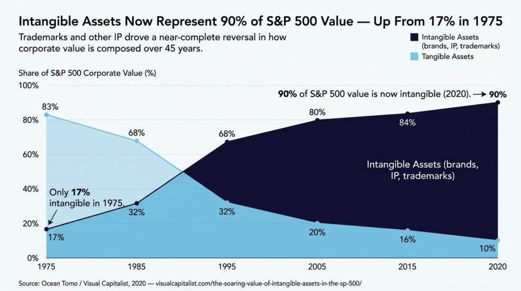 Intangible assets including trademarks, patents, and brand goodwill now represent approximately 90% of the market value of S&P 500 companies, according to data cited by Visual Capitalist tracking Ocean Tomo research. That figure was 17% in 1975. The shift reflects how fundamentally brand equity has become a driver of enterprise value across technology-driven markets. The bar chart above illustrates this trajectory from 1975 to 2020, with intangible assets now constituting the overwhelming majority of company valuations in public markets.
