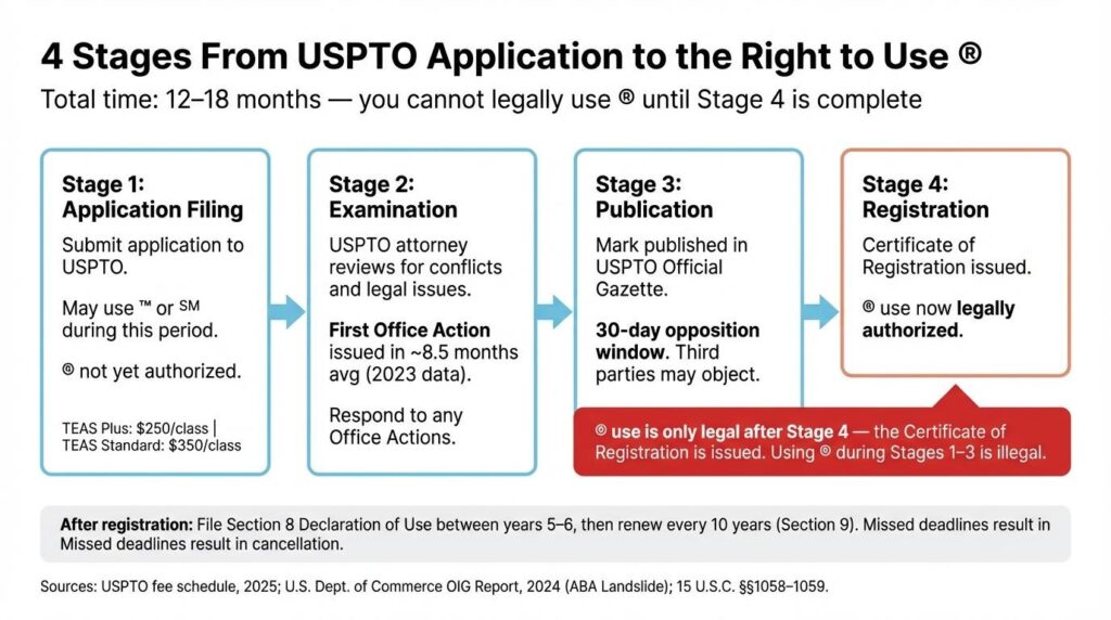 The four stages from USPTO application to the legal right to use ® are mapped in the process chart below, showing where in the timeline each key legal status change occurs.
