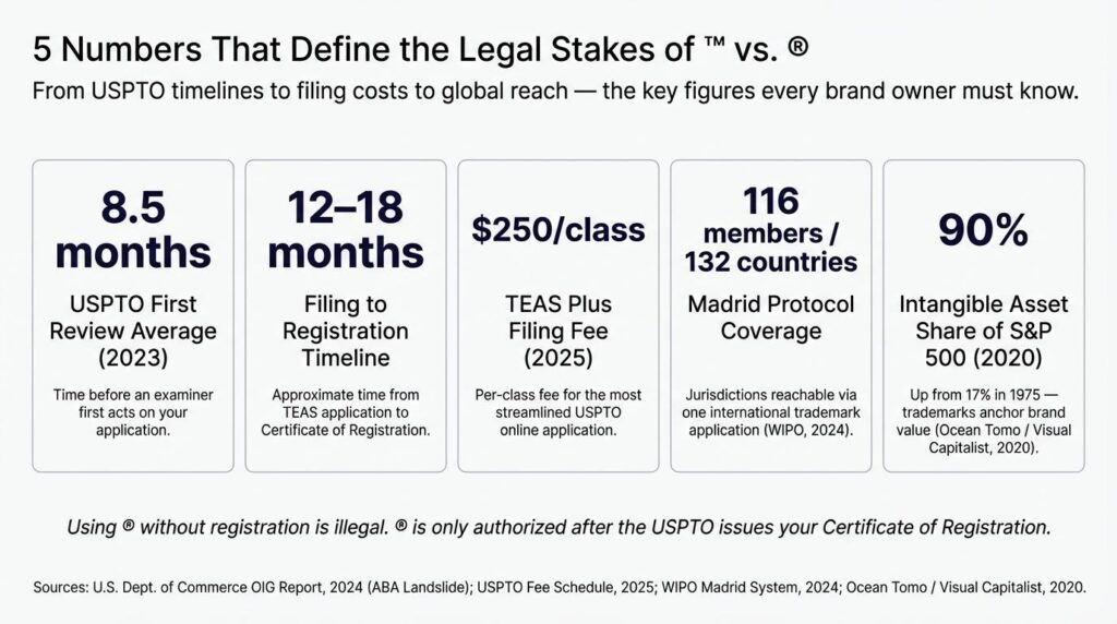 5 Numbers That Define the Legal Stakes of ™ vs. ® — Source: U.S. Dept. of Commerce OIG Report, 2024; USPTO Fee Schedule, 2025; WIPO Madrid System, 2024; Ocean Tomo / Visual Capitalist, 2020