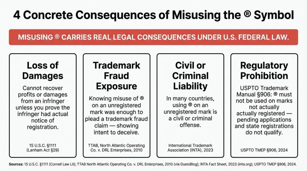 4 Concrete Consequences of Misusing the ® Symbol — Source: 15 U.S.C. §1111 (Cornell Law LII); TTAB North Atlantic Operating Co. v. DRL Enterprises, 2010 (via DuetsBlog); INTA, 2023; USPTO TMEP §906, 2024