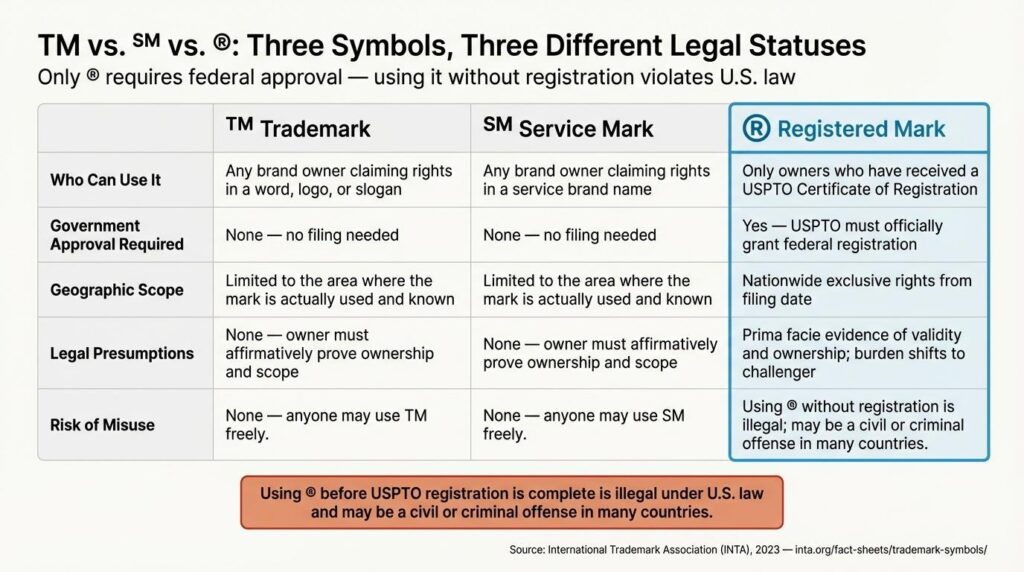 TM vs. ℠ vs. ®: Three Symbols, Three Different Legal Statuses — Source: International Trademark Association (INTA), 2023