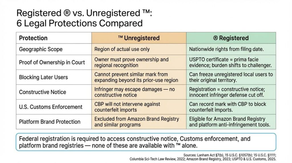 Registered ® vs. Unregistered ™: 6 Legal Protections Compared — Source: Lanham Act §7(b), 15 U.S.C. §1057(b); 15 U.S.C. §1111; Columbia Sci-Tech Law Review, 2022; Amazon Brand Registry, 2023; USPTO & U.S. Customs, 2025